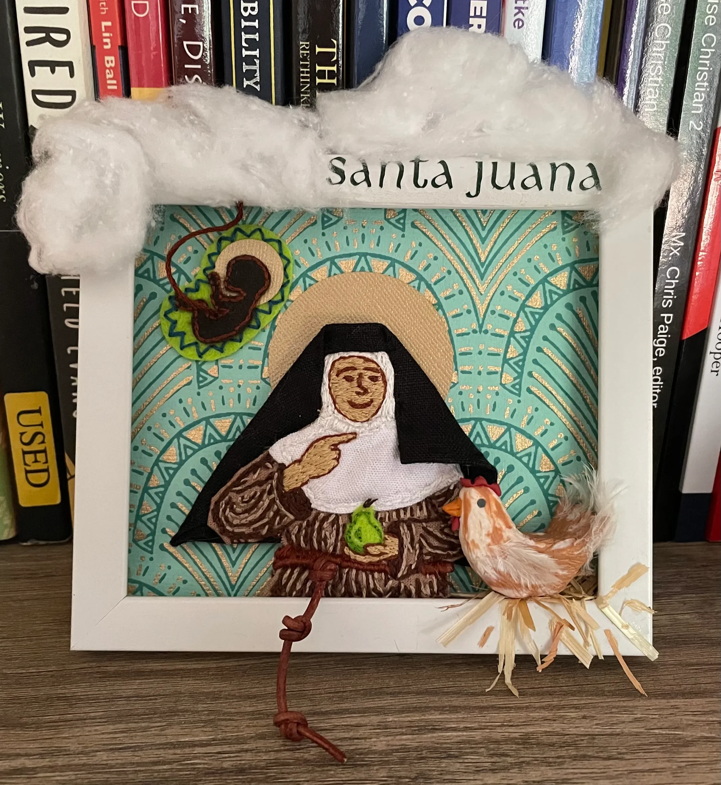 Multimedia artwork of Juana in a white rectangular frame. Juana wears her Franciscan robes, made with fabric and a leather belt; she smiles while pointing to her throat. Her other hand holds a green felt pear in front of her stomach. A polymer clay hen is perched on the frame in front of her, with straw glued beneath. To the upper left, a green felt womb holds a dark felt fetus with a gold halo, and an umbilical cord extending up into cotton clouds.
