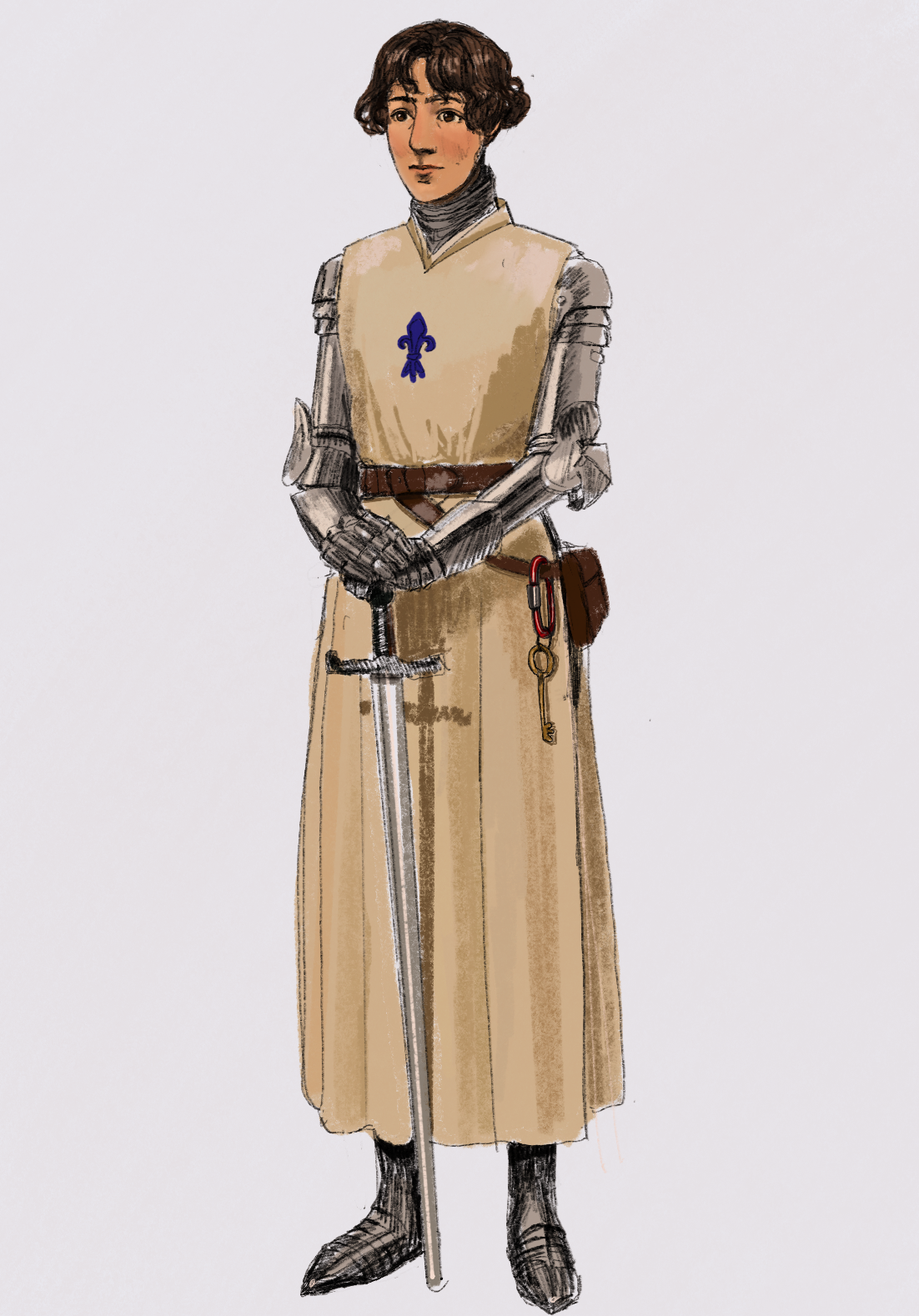 A digital painting of joan of arc. she is a young woman with short wavy hair looking ahead. she is in full armor and holding a sword. there is a red carabiner on her belt with a large gold key.