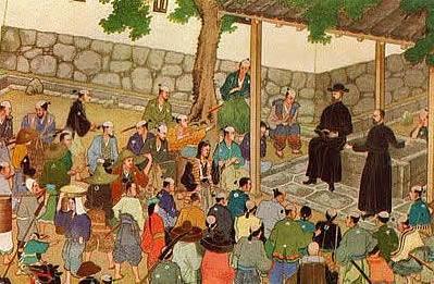 Missionaries in black robes talk to a crowd of people in traditional Japanese attire